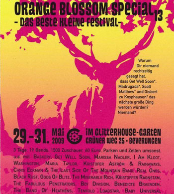 Und zum Schluss noch zwei Highlights im Mai. Wir sind wahnsinnig stolz auf den Ritterschlag des Orange Blossom Special 13 Festivals, welches uns neben I Am Kloot, Get Well Soon, Maria Taylor, Baskery, Kristofer Aström, unserem alten Freund Chris Eckman u.a. eingeladen hat im westfälischen Beverungen zu spielen. Das „beste kleine Festival“ findet am Pfingstwochenende im Garten des Plattenlabels Glitterhouse statt und ein paar Restkarten gibt es noch.